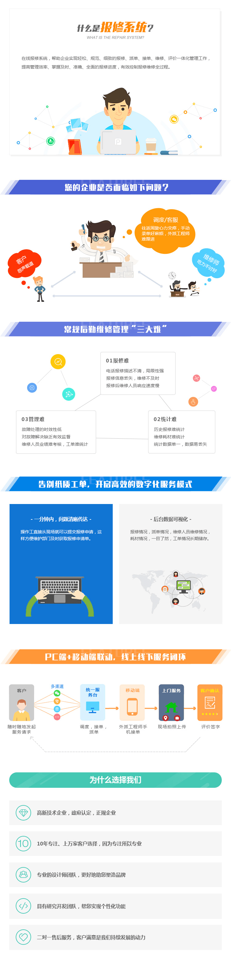 在线报修系统,帮助企业实现轻松、规范、细致的报修、派单、接单、维修、评价一体化管理工作,提高管理效率、掌握及时、准确、全面的报修进度,有效控制报修维修全过程。